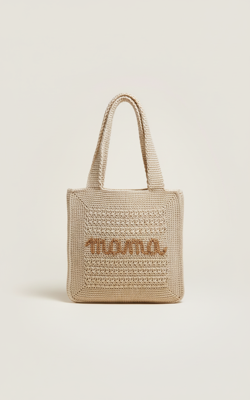 Ručno rađena handmade torba od pamučne pređe dostupna u bež, tamno smeđoj, svijetlo smeđoj i crnoj boji. Mogućnost personalizacije natpisom Mama ili imenom po želji.