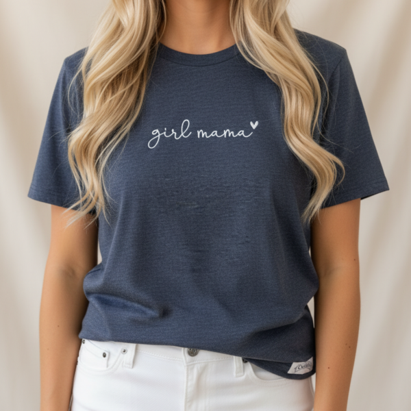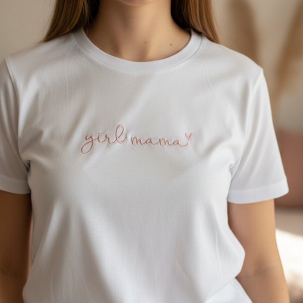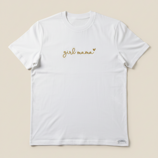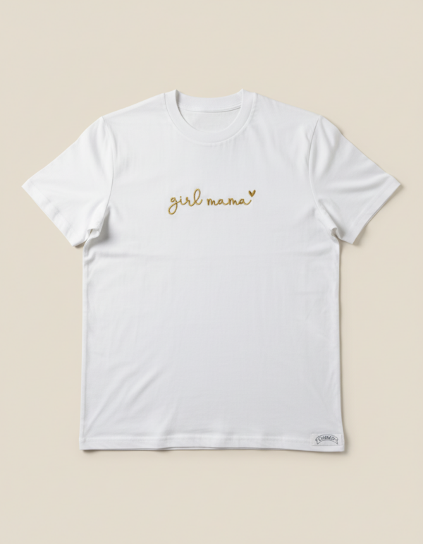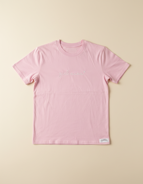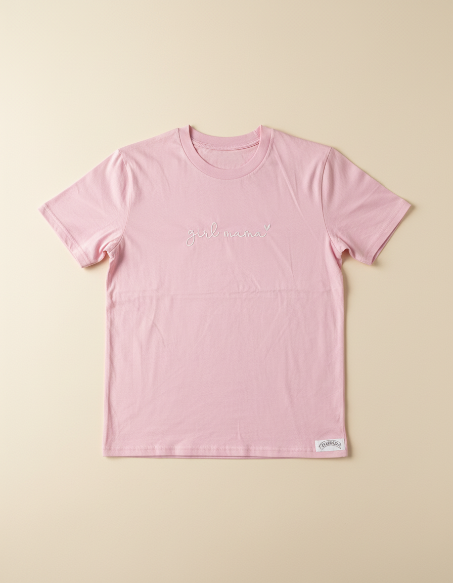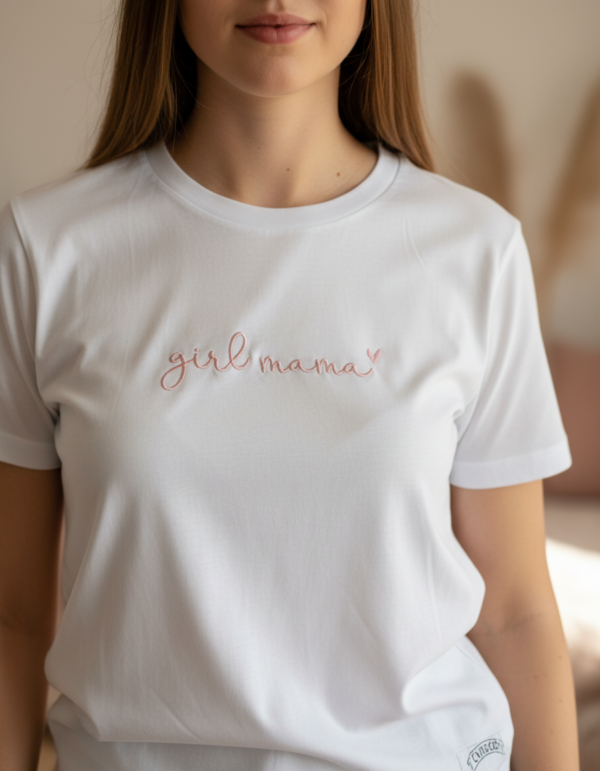 Majica Girl Mama je premium unisex kroja s izdržljivim strojnim vezom. Izrađena od 100% pamuka za udobnost kroz dan.