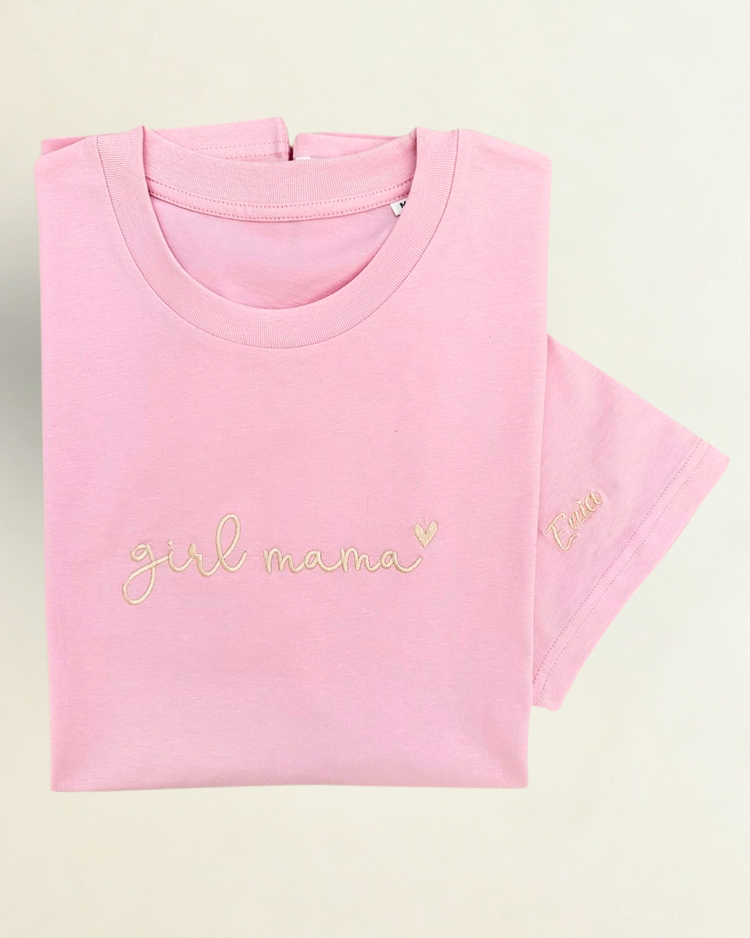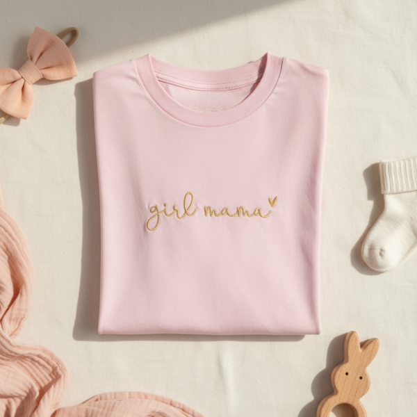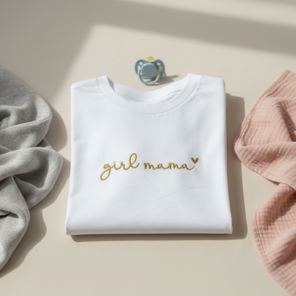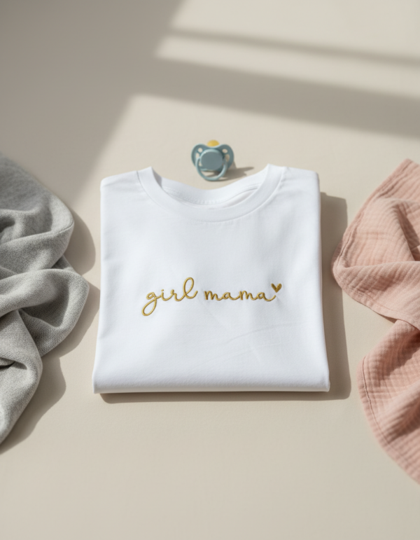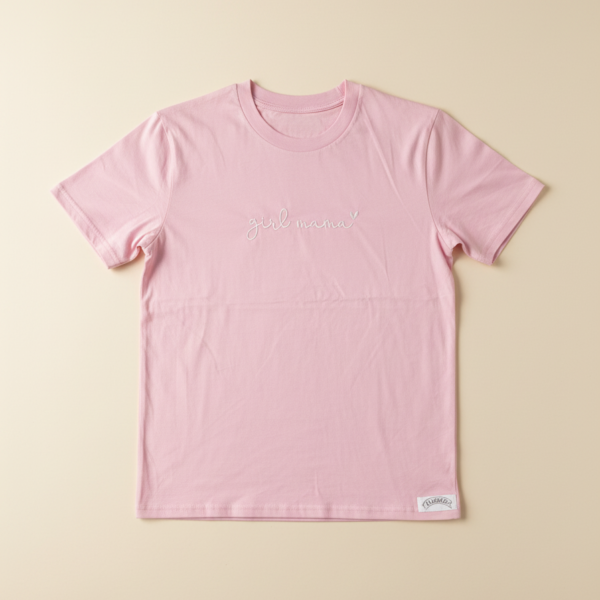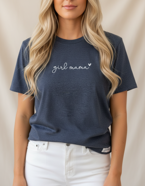 Majica Girl Mama je premium unisex kroja s izdržljivim strojnim vezom. Izrađena od 100% pamuka za udobnost kroz dan.