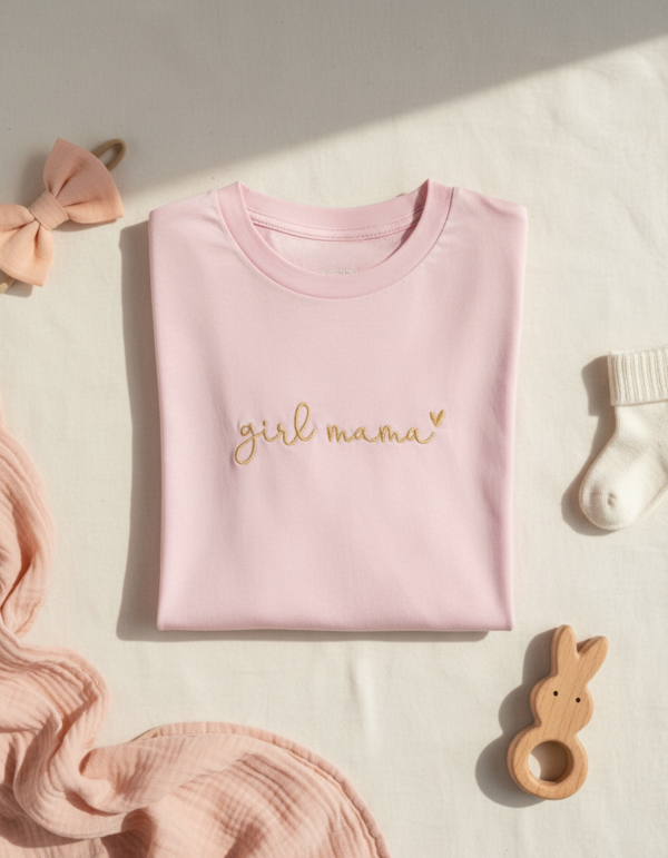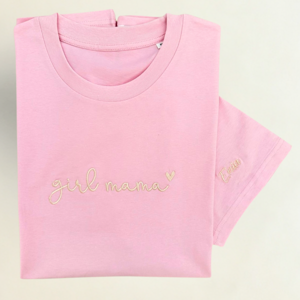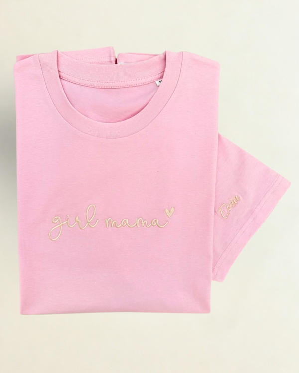 Dostupne boje majice: Cotton Pink, Dark Heather Blue, White; boje veza: Gold, Light Gold, Pink, White; veličine: S, M, L. Odličan izbor za gift, baby shower ili obiteljske fotografije. Ključne riječi: girl mama majica, vez, unisex, poklon.
